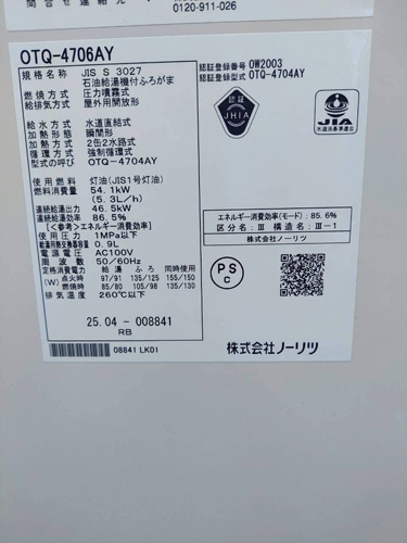 神戸市須磨区 ノーリツ給湯器→ノーリツ石油給湯機付ふろがまOTQ-4706AY 給湯器交換工事